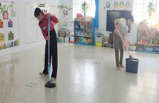 Hình ảnh cô và phụ huynh vệ sinh lớp sạch sẽ trước khi trẻ ngủ trưa